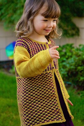 Evoking the texture of brocade, the two slip stitch patterns in this lovely coat dress provide a rich visual tapestry, yet are simple to execute. Wear- ing this sweet sweater, your little darling will feel like a princess who’s just stepped out of a fairy tale.