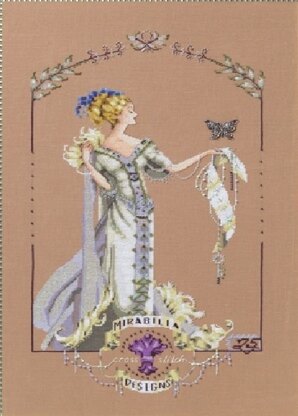 Lady Mirabilia - Un modèle très spécial pour le 25ème anniversaire de Nora Corbett. Lady Mirabilia est une célébration perlée d'argent. Elle est ornée de feuilles et présente des détails inspirés de l'Art Déco. Un charm papillon unique a été créé spécialement pour elle et est exclusif à ce modèle. Elle célèbre 25 ans de fées éphémères, de sirènes scintillantes et de visions de beauté féminine forte. Rêvant pour toujours en points de broderie, en fils et en perles. Modèle brodé sur du lin Milk Chocolate de 32 comptes.