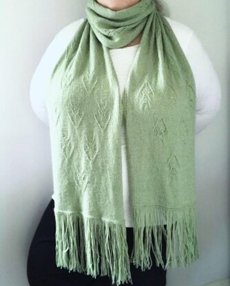 The pattern is an abstract lace-work thistle motif...Mum loved abstract ideas...surrounded by stocking stitch. The edge uses broken rib to keep it simple and clean. There are two versions of the scarf: fringed and non fringed and each end border is slightly different.