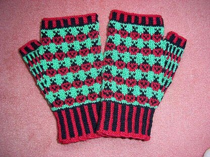 These cute ladybug allover fingerless mitts can be knitted from 4-ply sock yarn.