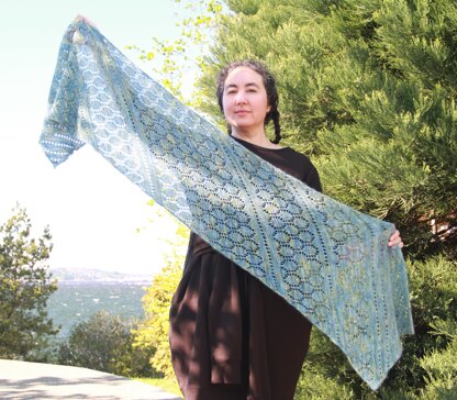 Lakes to Sound by Destiny Itano was the Seattle Yarn knit pattern for the 2019 Puget Sound LYS Tour. It is a light and airy lace pattern knit on the bias to create a scarf with one skein, or a wider wrap with two skeins. Worked in a merino/cashmere/silk blend from Indigodragonfly, it has a soft and luxurious feel. If substituting yarn, any fingering weight yarn with similar yardage will work; if you want a similar feel, a light and drapey blend is ideal.