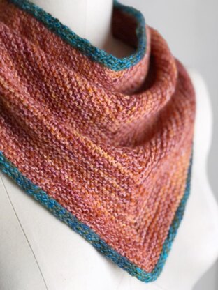 This bandana cowl pattern features garter stitch fabric with an i-cord edging. It is worked from the top down, beginning with a flat triangle, then joined to work a flared tube in the round. The pattern includes video tutorial links for the relevant techniques.
