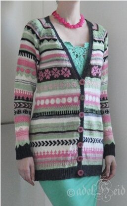Lamatakki is a timeless cardigan that is worked from top down in one piece without any seams. The basic model enables playing with left over yarns for stripes and/or stranded knitting. And that is actually the whole meaning of this pattern: to raid your stash and closet and do some discoveries for a new and very affordable cardigan.