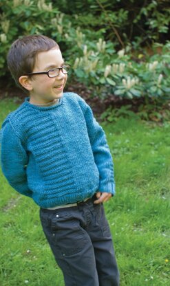 Off-centre purl ridges on the front of the body and the opposite sleeve add just enough interest to the knitting, while still keeping this pullover simple enough to wear. * SIZE & SKILL LEVEL Finished chest circumference - 25½ (27, 28½, 30, 32, 34) in / 65 (68.5, 72.5, 76, 81.5, 86.5) cm. To fit sizes 4 (6, 8, 10, 12, 14). Shown in size 6. Intermediate difficulty - Knit, purl, decreases, picking up stitches, working in the round, short rows. * MATERIALS AND NOTIONS 6 (6, 6, 7, 7, 8) balls of Garnstudio DROPS Alaska (100% wool; 50 g/ 82 yds / 75m); #52 dark turquoise. Substitute with approximately 450 (480, 500, 530, 570, 600) yds / 410 (430, 450, 480, 510, 540) m of Aran weight yarn that knits to the specified gauge.