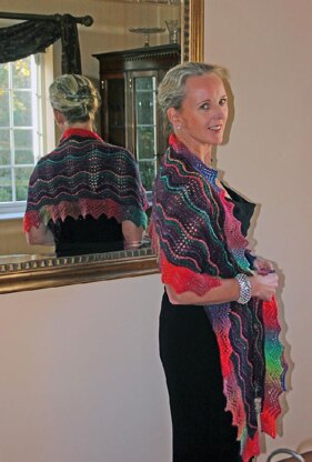 This rectangular shawl is a relatively easy shawl to knit. The centre panel is knitted in the Old Shale Lace pattern. The panel is cast on at the centre with a provisional cast on and knitted outwards either side of the centre cast on. Links have been provided to demonstrations of both provisional cast ons suggested in the Notes. The edging is knitted onto the shawl while casting off stitches as you go. The sample shawl has been worked in 3 colours of multi coloured sock yarn. It can be worked in a single colour yarn in either sock or lace weight. The materials in the pattern list the yarns used in the sample shawl and an alternative lace weight yarn.