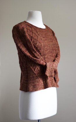 This cabled sweater is worked from the top down in separate pieces and seamed together at the sides. Leaning cables that flow into 1x1 rib along the sides creates an addictive knit. Sleeves are picked up and worked in the round from the top down.