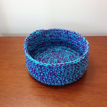 This bowl is easy to make and great for storage. It is perfect for toys in a child’s room, or to add color and organization to your kitchen, bathroom, or living area. It is made with two strands of worsted weight yarn held together.