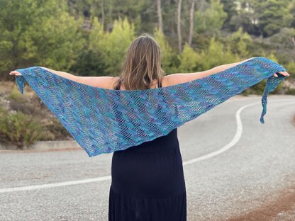 The asymmetric triangle alternates sections of easy-to-work ‘yo, k2tog’ eyelets with sections of stockinette to create light, lacy trails from the tip to the border. And like its sister design this pattern makes for an engaging, quick knit which will put your yarn in the spotlight.