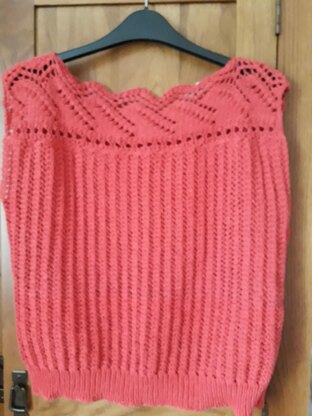Simple but effective design in a cotton mix yarn. Basic design being sleeveless is two identical pieces for front and back and two identical pieces for lace yoke edging.