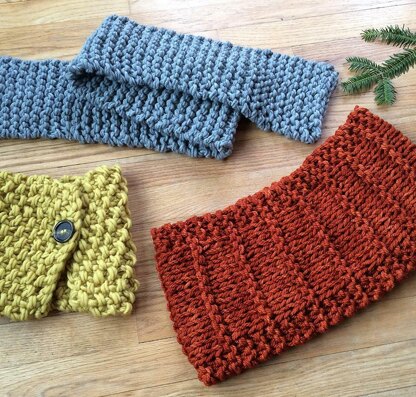 Last Minute Lucy is a collection of 3 different accessory patterns (scarf, buttoned neck warmer & cowl) that all use bulky-weight yarn held double on a big needle to create super thick, super fast-to-knit projects - perfect for quick gift-making!