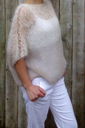 If you are looking to knit something lighter than air, gentle on hands, the Latte Sweater in soft mohair yarn, is the right choice for you. The modern, elegant, fluffy loose knit is worked in round, seamless, top down, using two tones mohair yarn.