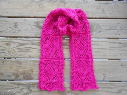 This fancy scarf will give you a lot of enjoyment to knit up in no time at all. With its eye-catching motifs, it will give you a very stylish accessory to add to your wardrobe! Each diamond motif is enhanced with a little latticework in the center. The pattern for this scarf is easy to work either with charts or written out instructions. You could easily use this pattern as a stash-buster. The scarf is quick to knit especially if using worsted weight yarn, with large needles.