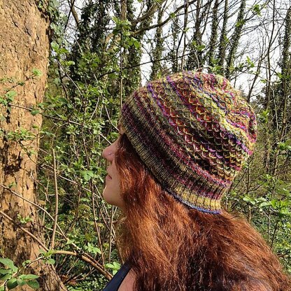 A slipped stitch pattern requiring about three quarters of a skein of sock yarn the more variegated the better the hat looks!!!!