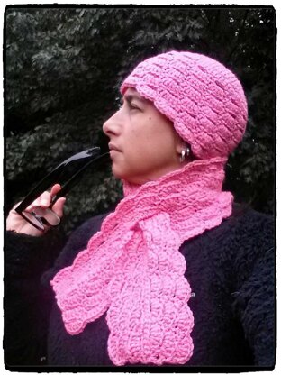 This scarf was inspired by Gloria Clayton's Flapper Shell Hat. She gave me permission to write the pattern for the scarf I created to match the hat she created. The scarf is worked on two sides of the foundation row to create a mirror image. It can be made with or without the keyhole and the length is easily adjustable.
