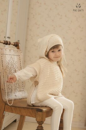 The charming Laureen poncho and hat knitting pattern set features a light and textured hooded poncho adorned with a beautiful dot pattern, accompanied by a matching slouch beanie. Perfect for boys or girls, this adorable poncho and hat set is an ideal addition to any little one's wardrobe.