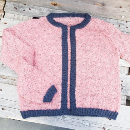 The Lavender cardigan is a simple raglan pattern, which is worked separately, bottom-up, then combined at the armholes. The delicate Daisy Pattern is worked throughout the pattern, and is rounded off by a twisted 1x2 rib along all edges of the cardigan. The yarn used is a mix of mohair, nettle fiber and wool, which results in both a warm and soft cardigan, perfect for chilly summer nights or mid-season wear. If you opt for a different yarn combination, make sure it allows the Daisy Pattern to stand out nicely and well defined.