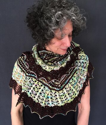 Layer Cake is a lively shawl confection in two contrasting colors with beads. It begins with a nautilus shell-shaped center section, then to layers of texture, stripes, and two beaded lace sections. This shawl, originally released in clues for a Mystery Knitalong, is a fun, engaging knit! It has a slightly asymmetrical shape which can be draped in many ways.