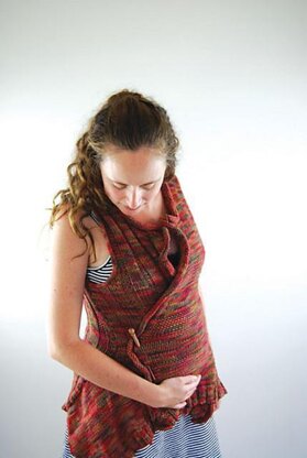 Features include modular inset panels between the front and back sections that create an unstructured flowing shape with a handkerchief hem. The small collar and front edgings are in stocking stitch that is slightly ruffled and deliberately allowed to curl. These design elements result in a chic modern look with textural interest.