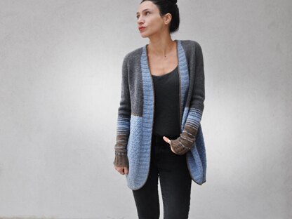 The sloped raglan shoulder, which is lower cut on the back than on the front, gives a natural looking and well fitting shape to the yoke, while accelerated short-rows at the fronts allow for a flattering form that permits the back-fold to sit higher up at the back and to flow into the generous draping and fuller volume of the body’s stitch pattern.