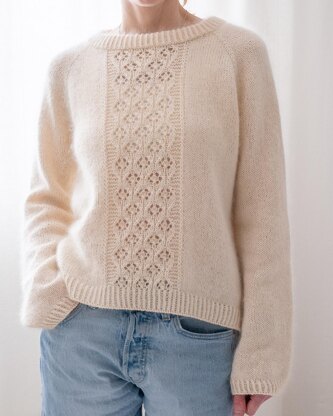 Cute raglan sleeved sweater with wide(ish) neckline, extra long sleeves and beautiful lace panel on front. The sweater is worked seamlessly from top down and requires minimal finishing. The work begins with the neck ribbing. The neckline is then shaped with short rows. When the raglan increases are completed, sleeve stitches are placed on hold. The body is then worked in the round towards the hem. Body ribbing is worked separately for front and back, creating a slit on each side. Sleeve stitches are then placed back on the needles and the sleeves are worked in the round towards the cuffs. The pattern includes photo tutorials for German short rows and M1b increase. The lace pattern is charted.