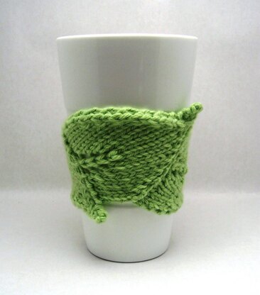 I designed this quick knit Cup Cuddler as a series of connected meandering leaves. It is seamed, pieced, and blocked. I recommend cotton yarn for a cold beverage Cup Cuddler and a wool/wool blend yarn for a hot beverage Cup Cuddler. It's a great pattern for using up those bits of yarn in your left over stash.