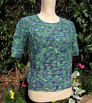 Neat and timeless top. The main body is worked in reverse stocking stitch with striking leaf panels “growing” out of single ribs. The leaf panels are also repeated on the sleeves. the neckband is worked in 2/2 rib and sits flatteringly just away from the neck.