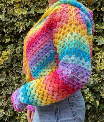 The pieces are joined as you go, so there’s no seaming afterwards. The sleeves are worked in the round downwards from the shoulder to the cuff. The hood is worked upwards in one piece and there’s a short seam to close the top of the hood. This seam is worked in ss and can’t be seen, even when the hood is down. This pattern is great for using up yarn scraps.