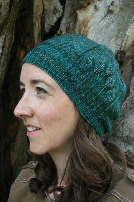 This irresistible hat is embossed with elegant leaves. To make it extra special, details are picked out with pretty beads. Worked in the round, this is a lovely project for an intermediate knitter - made easier if you choose to omit the optional beads.