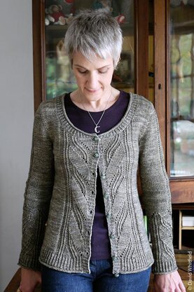A feminine cardigan or pullover with a loose hem and high, A-line shape. Close-fitting through bust and sleeves, it features a panel of curling openwork leaves at center front and back, as well as on the lower sleeve. A short flare of twisted-rib trim edges the hem, sleeves, front bands, and scoop neck.