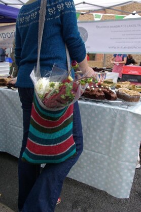 This useful bag is entirely seamless and a brilliant stashbuster. It knits from about 200g of pretty much any DK yarn. I’ve named it after Leeland Road in West Ealing where my wonderful local farmers’ market takes place every Saturday.