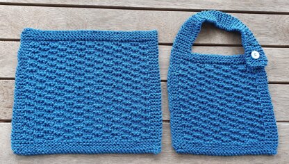 This matching 8ply Bib and Cloth are worked in an easy, knit and purl textured stitch, with a garter stitch border. This design will suit either a baby girl or boy.