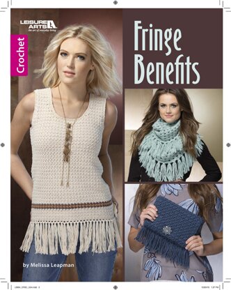 Leisure Arts Fringe Benefits Crochet eBook- Crochet fringed fashions that rock. These trendy designs prove that fringe can go anywhere and everywhere. Just a little bit adds edgy style to eight simple fashions. Easy level projects with size 4 medium or size 5 bulky weight yarn. Uses F, G, H, I and K crochet hooks. Designs include boho vest, sizes small to 2X, bracelet, bags, poncho, cowls and a scoopneck top sizes small to 3X. 34 page PDF download.