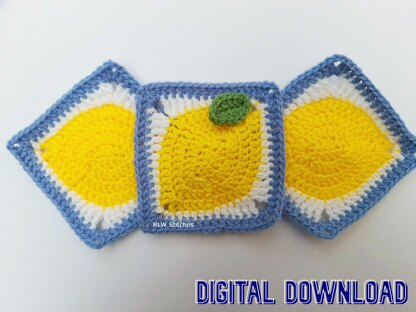 The block is worked in the round and always from the front, using a variety of stitches to create the lemon shape and the square around it. The pattern is for the block and optional matching leaf. Included are step by step photos and detailed written instructions.