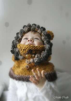 Introducing our Lion hooded cowl knitting pattern, the Leon lion Hood! This chunky and cozy hooded cowl is designed to keep your little one warm and stylish during the winter season. With its adorable little ears and charming puff stitch border, the Leon lion snoodis a must-have accessory for any boy or girl.