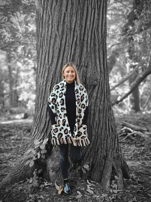 This striking leopard print pocket shawl is made using the C2C technique. Pockets are made with a matching pattern using the same technique and sewn on to the shawl. Finally, a tassel fringe is added to the bottom edges.