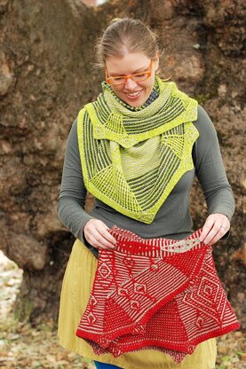 This pattern includes 2 versions - the fully patterned shawl, in fingering weight yarn, and a simple variation with twisted stitches only around the edges and garter stitch stripes filling the body, which is for any weight yarn and custom sizable.