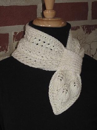 Les Feuilles Blanche is an elegant cross between an ascot and a scarf. It can be worn with the leaves pointing to the right or to the left - your choice! In addition, itâs a quick knit, using only one skein of worsted weight yarn. Not just outerwear, Les Feuilles Blanche, with its 3-D leaf buds, is pretty enough to wear all day. The pattern begins with a ribbed loop, proceeds to the lacy main section, then narrows to a rib again for the pass-through section, and finishes with the decorative leaf. The main body and leaf are worked with a built in i-cord edging that gives the piece a polished look. The final three stitches of the i-cord edges are grafted together at the base of the leaf point.