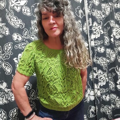 The design begins at the neckline and the short rows are hidden in the neck rib giving added dimension to the neckline without detracting from the beautiful lace design.