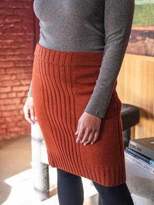 staple. This simple top-down skirt is worked in the round with ribbed panels adding a chic design element.