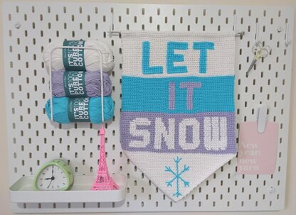 A modern, bright and airy winter decoration to hang in your home. Quick and easy to create, suitable for beginners. The pattern creates a base fabric in crochet which is then embellished with sewn cross stitch for the lettering.