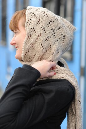 Levee is a hood with long scarf tails worked in a pretty, easy to work, and not too open lacy stitch pattern with garter stitch trims. The hood is substantial enough to provide warmth, but light enough to not add a lot of bulk at the back of your neck when worn down. As much as I love hats, I get crazy “hat head” instantly, so once I put one on it has to stay on. But with a hood I can keep keep warm without plastering my bangs to my forehead!