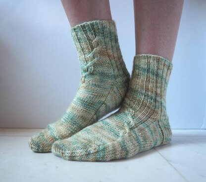 Inspired by an ivy branch (called lierre in French) climbing around a tree, these socks feature a deeply textured cable pattern over ribbing on one side and purl on the other, which makes them the perfect accessory to use your favorite variegated or self-stripping yarn. Both socks are different, forming an eye-catching symmetrical pattern.