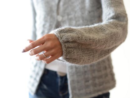 “Like a Waffle” is a quick-to-knit raglan cardigan with a lovely waffle pattern on the body. The sleeves come with two options: bell-shaped or balloon-shaped. It is worked from the top down back and forth with raglan increases and German short rows are used to shape the front neck. After the sleeves are set aside at the underarm, the body is worked to the hem with Waffle pattern. The sleeves are knit in the round with increases, to 3/4 length for Bell sleeve version and full length for Balloon sleeve version. The front and neck edging are neatly finished using I-cord, with integrated buttonholes.