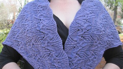 This heavy fingering weight (or sport weight) triangular shawl incorporates a single cable lace stitch that comes to us from Japan. It is knit top down, and the stitches cause a pretty and delicate scallop at the neckline, while the small but unique cable contained within the lace, adds dimension and interest. While the shawl looks difficult to knit, it is not hard, and is suitable for Advanced Beginners, with some cabling experience.