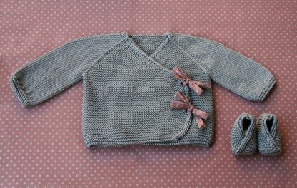 This little wrap is knit in one piece, from the top-down, and can be totally seamless if you knit the sleeves in the round (both instructions to work the sleeves flat or in the round are included). Closed with 2 little ties, it will allow you to use your most beautiful ribbons to make it a sweet heirloom. The ties are removable, so you can replace them whenever you want: change colors according to your mood or your little one’s outfit! The kimono booties will be the cute matching finish to outfit!