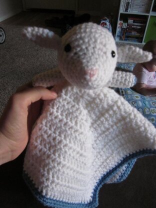 "Lovey" or "Security Blankey" of a lamb. I think it would look very cute if you brushed the yarn to fluff it up.You can also use blue or pink for the accents depending on the gender. I use it in my babies car seat to keep her legs warm and hands entertained. She also likes so snuggle it.