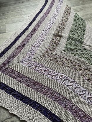 This top-down triangle shawl is a simple garter knit with lace sections of flowers. The main colour is a neutral to show off the colours of the mini skeins. Purple is my favourite colour and I was inspired by Lilacs. When I decided on the name Lilac, I did some research and discovered that Lilacs are the most common plant that blooms in Ukraine, with much significance and integration into culture and folklore. My Ukrainian heritage runs deep, and I am constantly learning about my Ukrainian culture and heritage. I feel my ancestors spoke to me in the design and name of the Lilac Shawl.