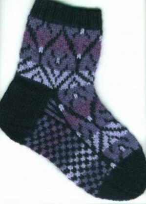 Brown Sheep Nature Spun Worsted, 100% wool, 245 yds / 3.5 oz pull skeins: 1 skein each #119 Bulldog Blue or #730 Natural (MC), N64 Platte River Blue (CC1), N66 Mill Blue (CC2), and N80 Mountain Purple (CC3) (2 skeins of **MC **will allow 2 pair to be knit.)