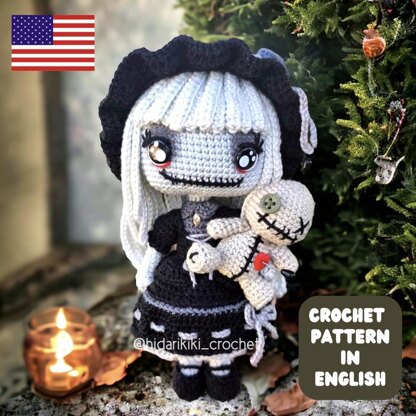 PDF pattern to crochet a terrifying but cute Victorian gothic doll named Lilith and her voodoo doll, Booboo.