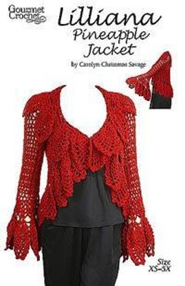 "Add a dramatic flourish to your outfit for any occasion with this lovely crocheted shrug-style jacket bordered with a generous pineapple edging. "Wear Lilliana open down the front or pinned at center front. The pineapples fall gracefully around the shawl collar, bottom, and the generous bell sleeves. It’s lovely falling naturally with no pin, or with a new or vintage jeweled brooch or button holding it in place."